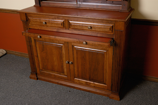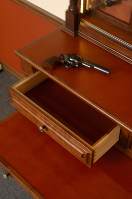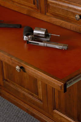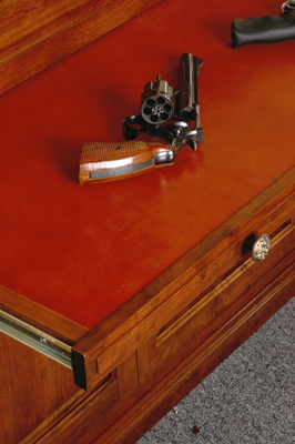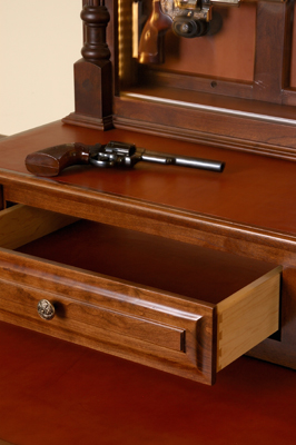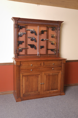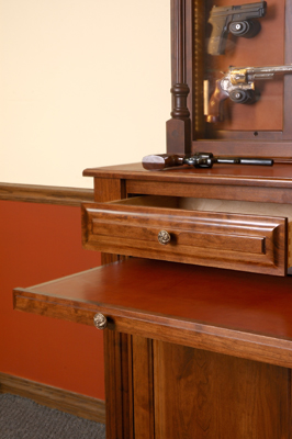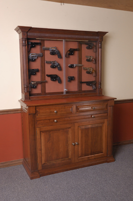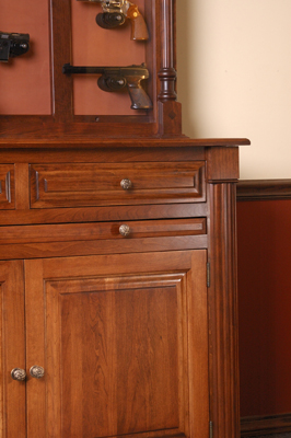 Our Amish custom made display display cabinets can be crafted to be floor standing or to hang on the wall. Cases can be crafted with full extension doors flush mount drawers in numerous different styles. Cabinets can be made with locks on all pieces to protect cleaning supplies and ammo collections. Drawers can also be felt or leather lined to provide premium cleaning surfaces for all collectible pistols and long guns. Glass sliding doors can be crafted with standard glass, beveled glass, or even 1/2 bullet proof polycarbonate for maximum protection.