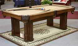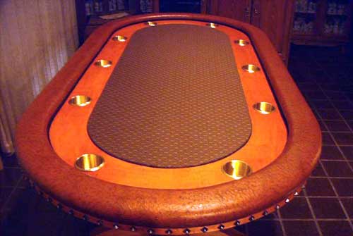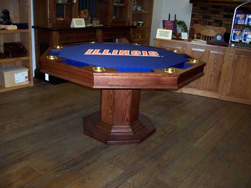 Another item that has been growing in popularity is our custom made poker and Texas hold 'em tables. All of our poker tables are custom made in your choice of colors, styles, and choice of speed felt. Poker tables can be custom made with removable solid dining tops for when the game top is not in use. You can even have your poker felt custom made with your own log. Pictured on left is our Illinois poker table that we keep on our showroom floor. (Yeah, we will even make these with Hawkeye, Badger, Mizzou or Spartan logos.) |
