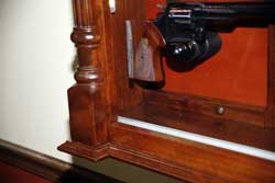 After we finalized our main goal, which was security, we then shifted our focus on designing one of the most eye pleasing display cabinets made. Each of our pistol display cabinets can be custom crafted in your choice of sizes, solid woods, colors, designs, and pistol setups but the majority of our customers have ordered their cabinet to look exactly like the one pictured here. We utilized solid cherry hardwood, custom crafted molding, and LED lighting. Each of the pistol trigger locks is universal and can fit numerous shapes and sizes of pistols.